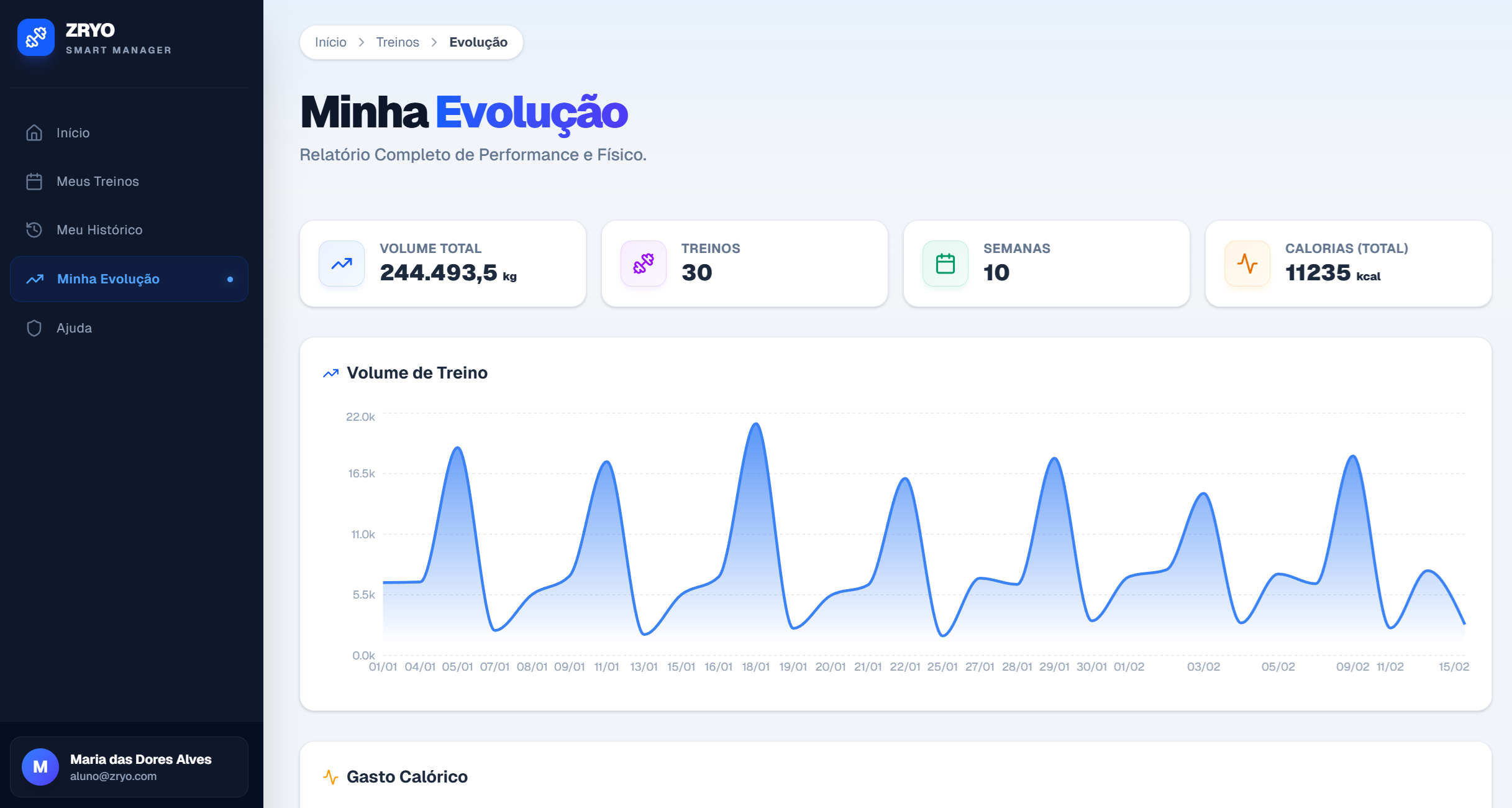 O ZRYO transforma cada gota de suor em um ponto no gráfico. Para o Personal, é a ferramenta de retenção definitiva. Para o aluno, é a certeza de que o esforço está valendo a pena.